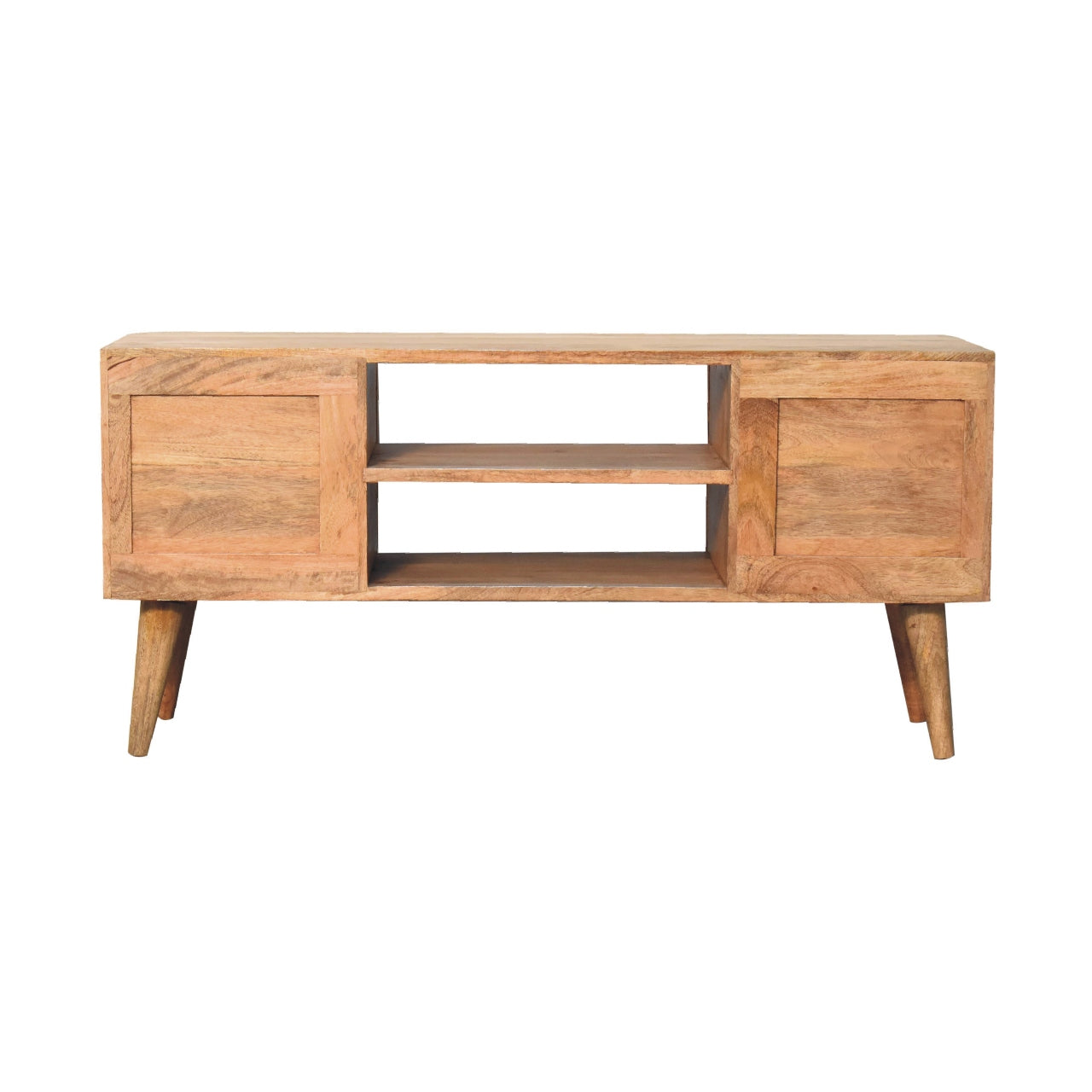 This beautiful boho-inspired media unit has been constructed from 100% solid mango wood and has a fine oak-ish finish. Other features include 2 open slots and 2 bone inlay front cabinets as well as Nordic-style legs. The bone inlay is sourced responsibly from deceased animals such as camels, goats, and buffaloes.