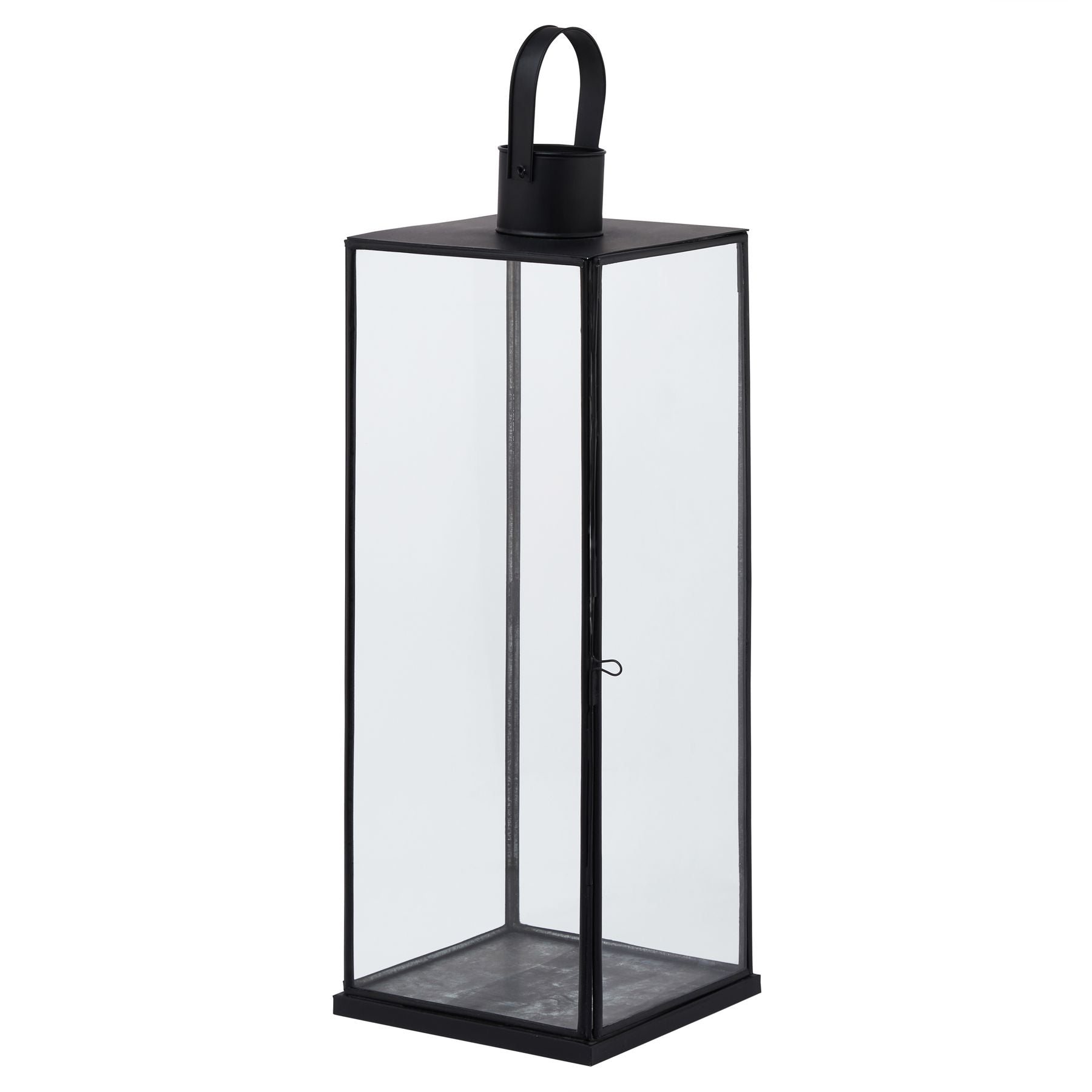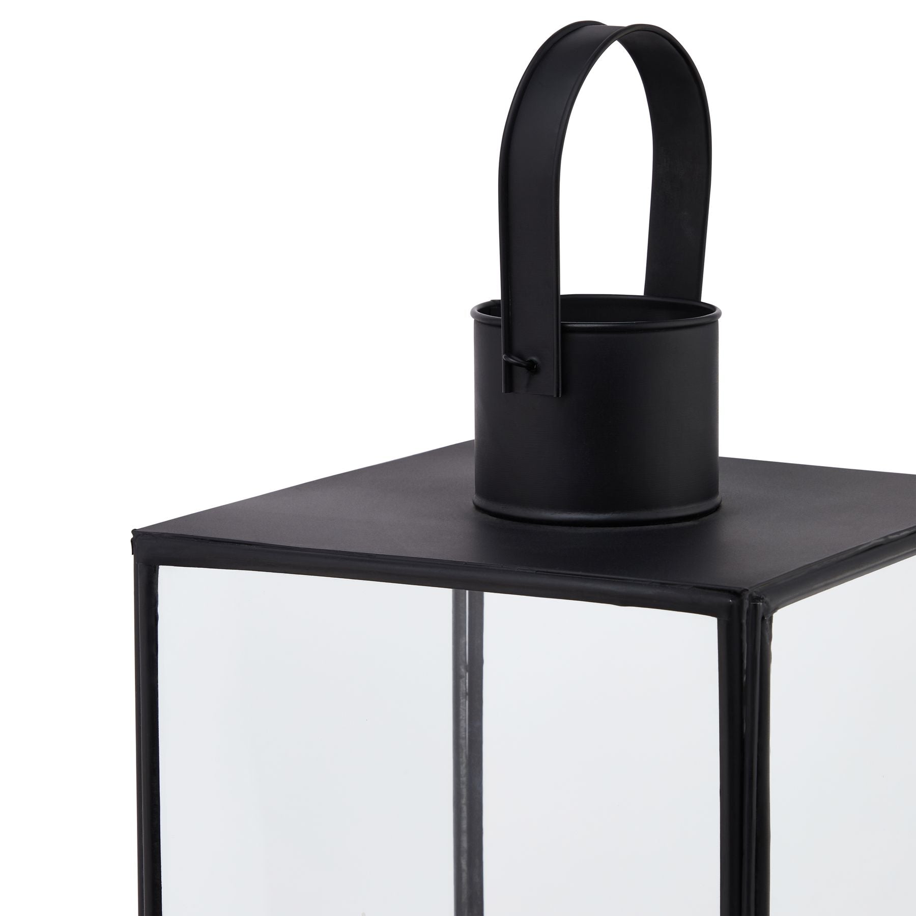 This is the Flat Top Black Lantern. This stylish black metal lantern is a contemporary style statement that will add not ambience and interest to a space. Additional sizes available in the same style for impactful staggered height displays. Finish the look with one of our realistic LED wax candles.