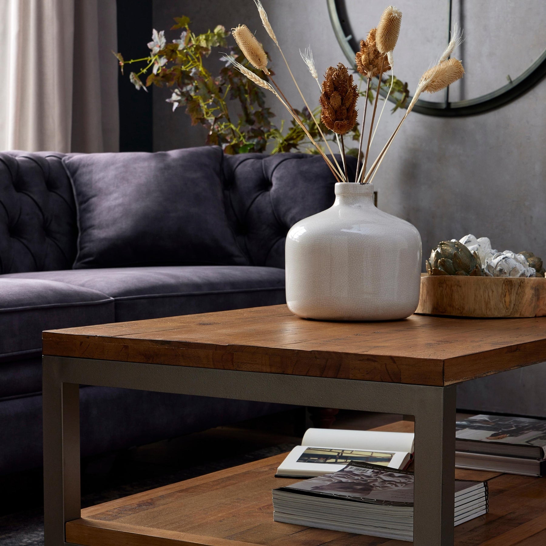 This is the Garda Glazed Chive Vase, a crackle-glazed ceramic piece with distressed details that add wonderful character. Available in three color options: striking emerald green, popular grey, or cream colorway. This slim-necked vase will perfectly complement any flower arrangement.