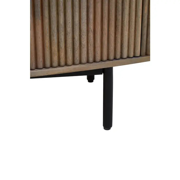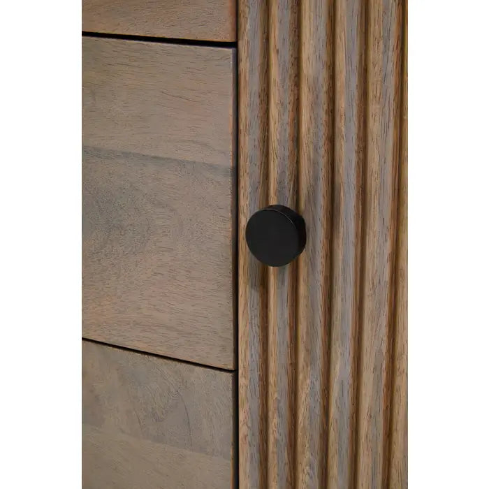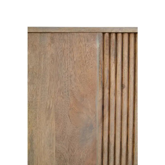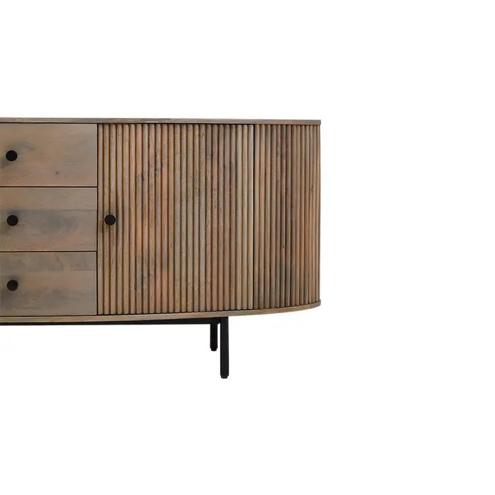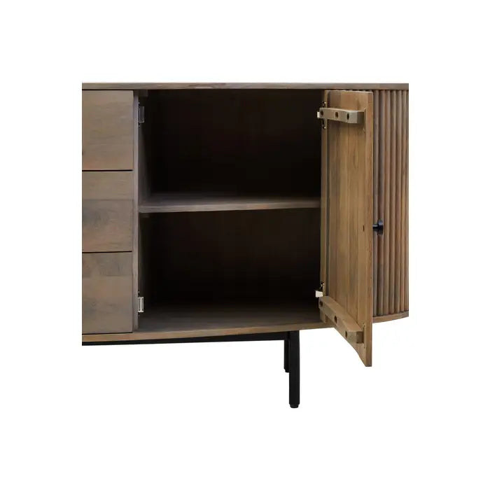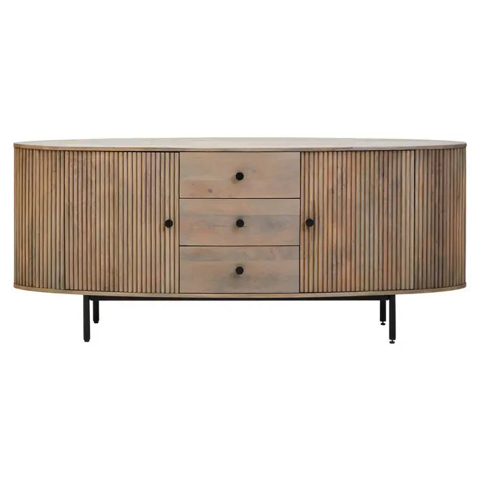Organize your space in style with the Verona Grey Mango Wood 3-Drawer Sideboard. Crafted from durable solid mango wood, this sideboard features elegant ridge detailing and a sophisticated grey finish. Three spacious drawers and two cabinet doors provide ample storage for dining essentials, home accessories, or office supplies.