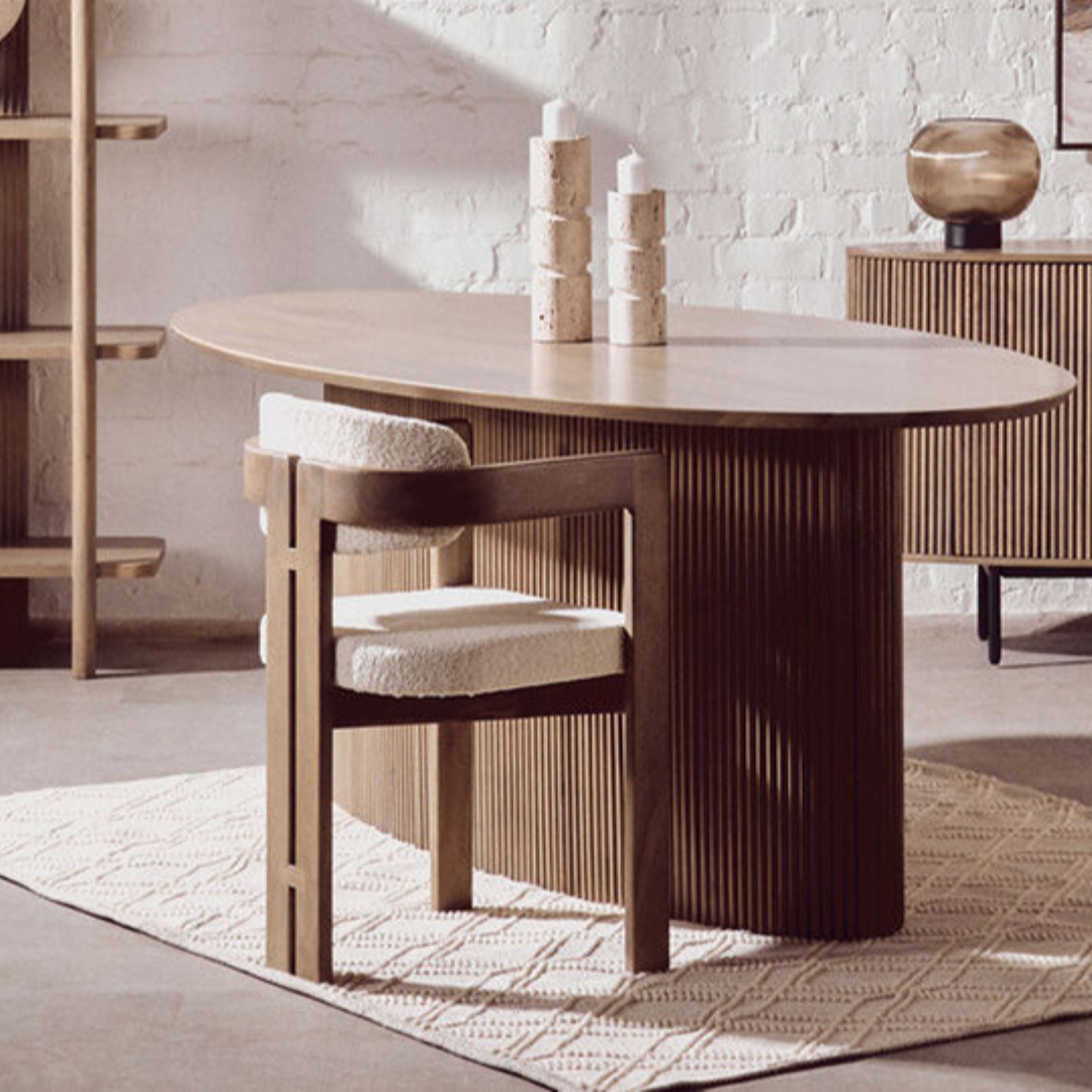 Create unforgettable dining moments with the Verona Grey Mango Wood Oval Dining Table. Featuring a beautifully ridged base and a spacious oval tabletop, this contemporary centerpiece is crafted from 100% solid mango wood. The smooth grey finish and natural grain patterns bring warmth and sophistication to any dining room.